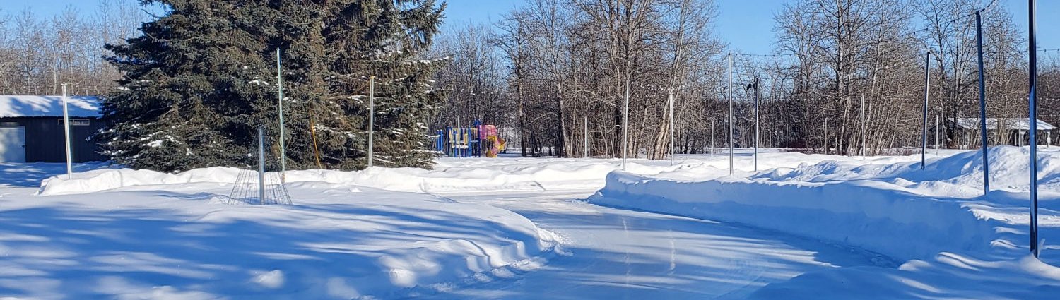 Magical outdoor skating trail winding through the trees at Cardiff Park. Bordered with party lights, the trail passes other lit-up Christmas displays set up in the park by Sturgeon County.